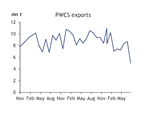 PWCS shipped 4.98mn t of coal in July, down from 8.7mn t in June and from 10.57mn t in July last year. The port has been operating normally for the past fortnight, after heavy rainfall at the beginning of July cut deliveries to the port and forced ships off its anchorage. But a drier start to August could see exports rise.