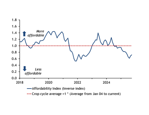 An affordability index — comprising a fertilizer and crop index — above one indicates that fertilizers are more affordable compared with the base year set in 2004. An index below one indicates lower nutrient affordability.