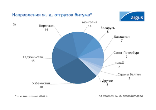 Основной объем битума в первом полугодии поступал в Узбекистан: отгрузки в этом направлении выросли до 64,7 тыс. т с 300 т — в аналогичном периоде 2019 г. Большие объемы продукта также поступали в Киргизию и Таджикистан: общий объем отгрузок составил 64,2 тыс. т. Увеличение экспорта в этих направлениях обусловлено активизацией строительства дорог в данных странах. Новыми направлениями поставок битума стали Белоруссия, а также Китай, Грузия и Туркмения.