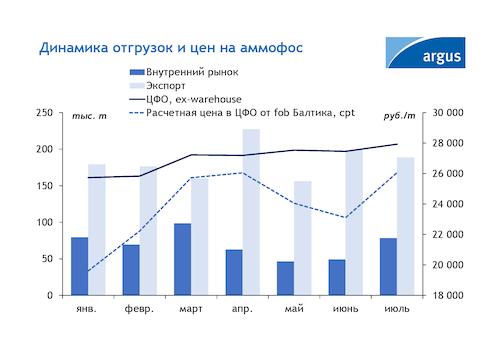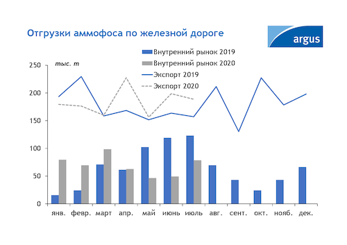 За январь — июль 2020 г. на российский рынок было отгружено 484 тыс. т аммофоса, на 30 тыс. т меньше, чем за аналогичный период в прошлом году (см. график). Причем если в I квартале 2020 г. поставки продукта шли с двукратным опережением относительно прошлого года за счет высокого спроса со стороны агрохолдингов, активизировавшихся из-за ослабления национальной валюты, то начиная с апреля темпы отгрузок аммофоса начали динамично снижаться. Сельхозпроизводители переключили внимание на другие удобрения, а объемы продаж аммофоса на базисе региональных дистрибьюторских центров оставались незначительными. Заводы переориентировали свободные объемы продукта на экспортные рынки, а отгрузки удобрения на внутренний рынок в мае — июле 2020 г. снизились вдвое по сравнению с аналогичным периодом годом ранее и составили всего 174 тыс. т (см. график). В результате сельхозпроизводители, которые отложили приобретение аммофоса на август — сентябрь, столкнулись с проблемой отсутствия необходимых объемов продукта на рынке и необходимостью покупать альтернативные удобрения для внесения в почву осенью.