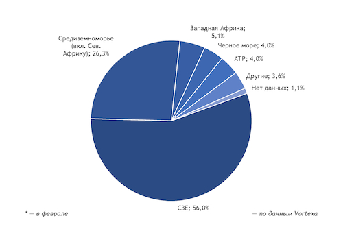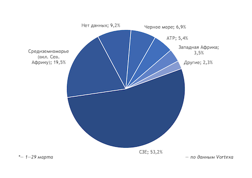 Морские отгрузки дизельного топлива из России в Северо-Западную Европу (СЗЕ) и Средиземноморье 1—29 марта сократились на 10,6 тыс. т/сут. относительно показателя за весь февраль, до 809,2 тыс. т/сут., из-за слабого спроса на продукт в регионе.