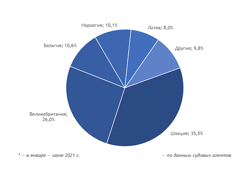 В балтийские порты России продукт поступает преимущественно автотранспортом. В первом полугодии битум из Санкт-Петербурга и Ломоносова экспортировался преимущественно в Швецию и Великобританию и другие страны Северо-Западной Европы (см. диаграмму).