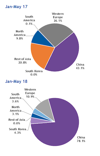However, feedstock EB exports to China have increased over last year as a way to circumvent styrene ADD. This comes as China remains net short SM and ethylene-based feedstock EB. China received 78pc (87,000t) of total US EB exports from January-May 2018, which totaled 112,000t, up from 42pc (28,000t) of total EB exports from January-May 2017, which totaled 65,000t.