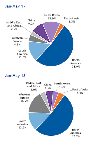 American Fuel and Petrochemical Manufacturer's (AFPM) data shows that US styrene exports to China from January-May 2018 fell to 6pc (37,920t) of total US styrene exports at 632,000t.In January-May 2017 US exports to China were 9pc (55,080t) of total styrene imports 612,000t.