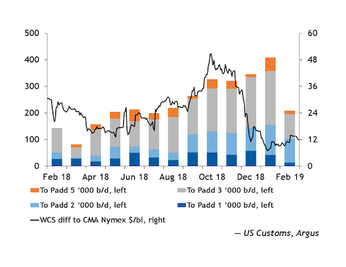 Canadian railed crude exports have been cut in half from their late 2018 peak amid narrower differentials. But shippers are looking to late 2019 and early 2020 for a resurgence in demand to rail heavy Canadian crude to the US Gulf coast.
