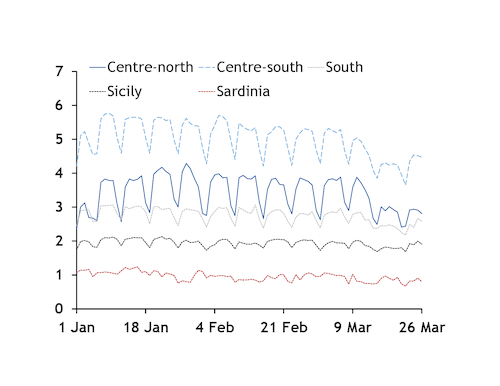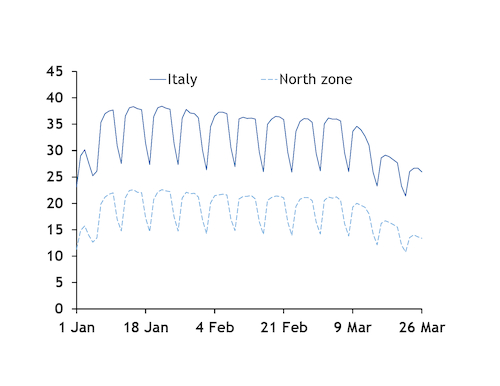 But southern regions showed a different trend, with demand in the central-south zone rising by 0.2GW compared with a week earlier to an hourly average of 4.4GW. Demand in the south zone remained flat, at an hourly average of 2.5GW, while in Sicily it rose to 1.9GW, compared with 1.8GW over 16-19 March. Demand in Sardinia fell to an hourly average of 838MW, compared with an average of 906MW a week earlier, Entso-E data show.