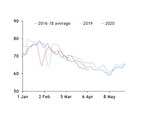 Daily peak power demand typically falls through the first four months of the year, before rebounding from early May as the cooling season begins. The seasonal lull in demand is likely to be particularly severe this year because of the coronavirus, with peak electricity consumption already trending below 2019 and the 2016-18 average since early March (see chart).