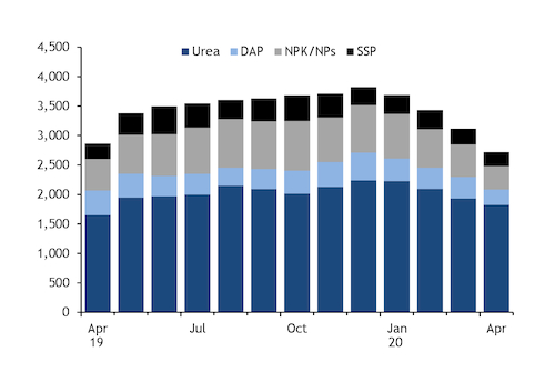 Fertilizer sales in India typically gather pace through the spring ahead of the kharif season, peaking in July-August with the onset of the monsoon season. Sales were solid through the September-March rabi season, with DAP sales in 2019-20 outstripping the year before by a third at 6.53mn t.
