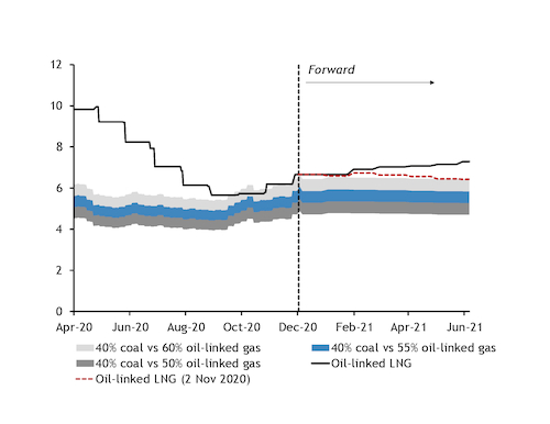Weaker oil prices since spring have pushed oil-linked LNG supply towards coal-switching prices in South Korea in recent months, potentially displacing some of the solid fuel from the power mix. But if the recent recovery in oil prices holds or is extended further, term LNG supply would become increasingly uncompetitive with coal next year in South Korea and elsewhere in the Asia-Pacific.