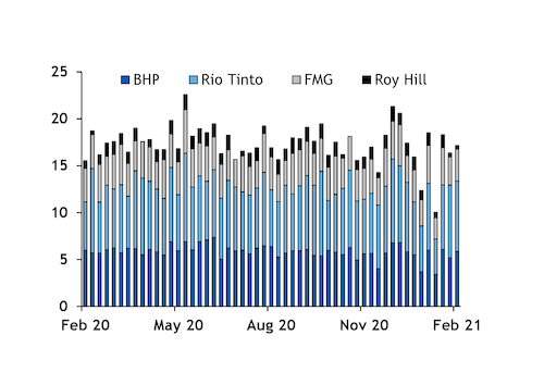 The four WA producers — Rio Tinto, BHP, Fortescue Metals and Roy Hill — loaded vessels with 17.17mn deadweight tonnes (dwt) of capacity in the latest week. This was up from 16.36mn dwt in the week ending 20 February and slightly below the average of 17.36mn dwt/week over the past year.