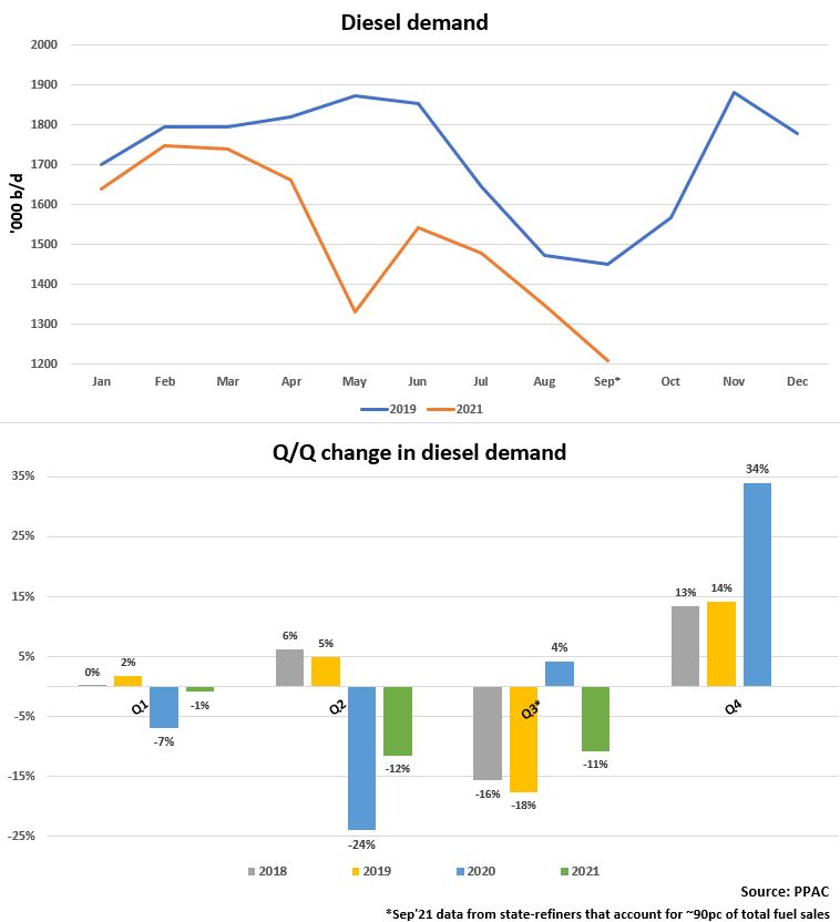 Domestic diesel use was at 1.21mn b/d in September, down by 7pc compared with the same time in pre-pandemic 2019, according to demand figures from state-controlled refiners that account for around 90pc of the country's fuel sales. This was because of higher domestic prices and a monsoon-induced fall in trucking activity.