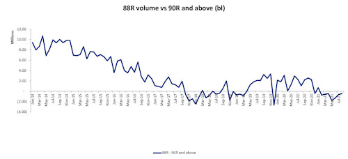 The volume spread between gasoline cargoes with a Ron rating above 90 and other motor spirit, presumably 88R, has increased considerably over the years (see graph). Indonesia imported an average 9.19mn bl/month more 88R gasoline than cargoes with a Ron rating above 90 in 2014, according to GTT data. But that trend reversed in the first half of 2021, with Indonesia importing an average 687,178 bl/month less 88R gasoline than cargoes with a Ron rating above 90.