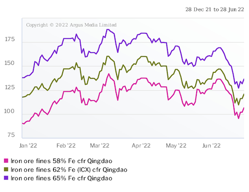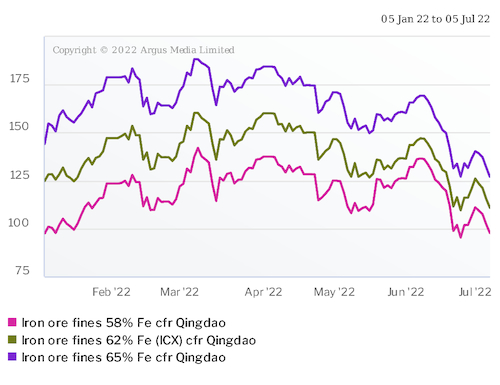 Argus ICX iron ore was last assessed at $110.85/dry metric tonne (dmt) cfr Qingdao on a 62pc Fe basis on 27 June, down from $136.20/dmt on 13 June and $160.20/dmt on 7 March.