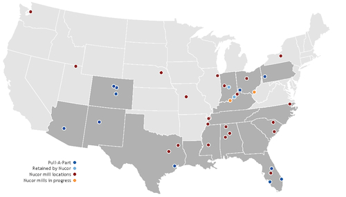 Nucor will retain ownership and operation of its two separate self-serve used auto parts locations in Indianapolis, Indiana, and Louisville, Kentucky.