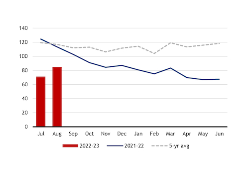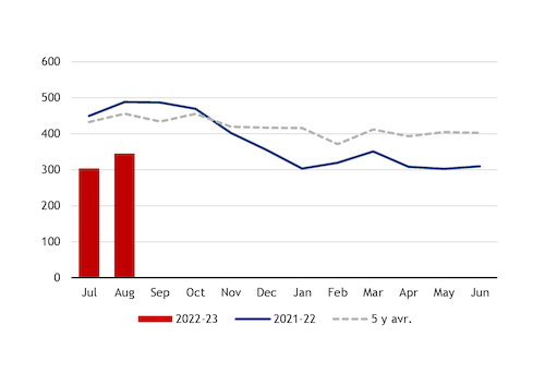But steady declines in domestic poultry and pig slaughter have offered a greater downside to feed consumption. France's monthly poultry slaughter rates stood at 110,000t in July, below the seven-year average of 137,000t, while cumulative volumes from January to July reached 846,000t, compared with an average of 963,000t for the period over 2014-21, Eurostat data show.