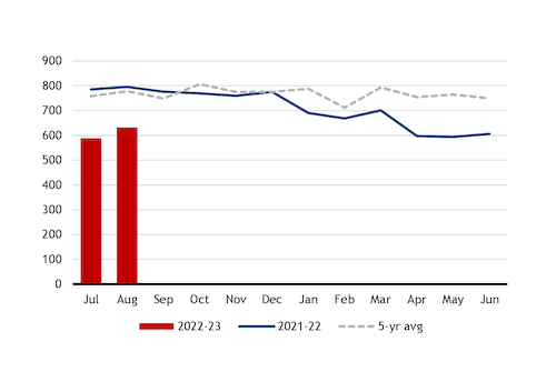 The decrease was mainly pronounced for wheat, with the feed industry consuming 650,000t of the crop in July-August, down from about 940,000t a year before. The use of barley fell to 155,000t from 240,000t a year ago. Corn consumption saw a marginal increase to 415,000t in 2022-23 from 406,000t a year before.