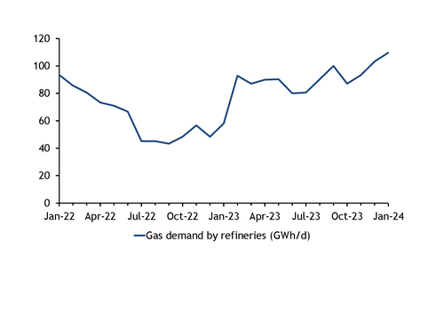 Gas demand by Spanish coke and oil refineries, the largest industrial gas-consuming segment in the country, reached nearly 110 GWh/d last month. This was the highest since August 2021, and nearly double the 58 GWh/d in January last year (see graph). Refineries alone accounted for more than 10pc of aggregate gas demand in Spain last month.