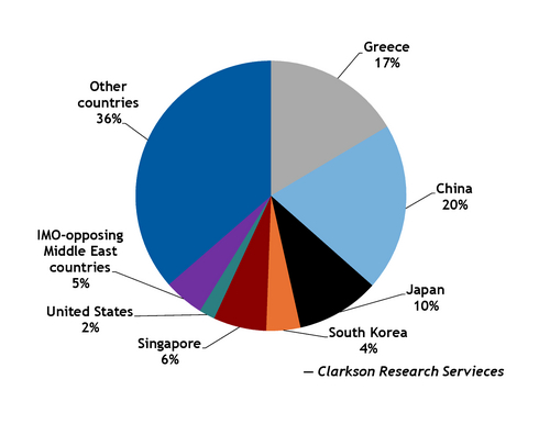 Greece, China and Japan's merchant vessels, alone had total of 1.1bn t deadweight, or 46.5pc of the global merchant fleet deadweight, according to Clarkson. Singapore, South Korea and Norway accounted for 304.1mn t deadweight, or 12.6pc.