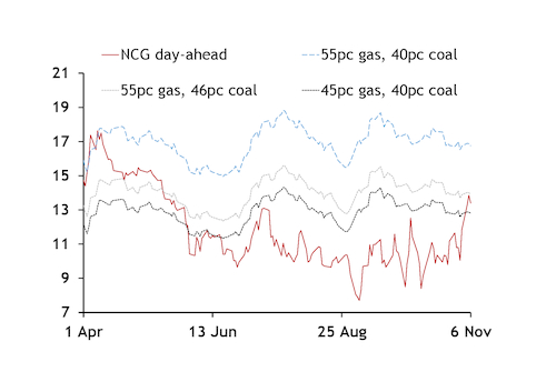 But gas burn fell early this month, leaving some of the region's most inefficient gas-fired plants further down in the merit order. But TTF and NCG prompt prices were still firmly in fuel-switching territory, with 54pc and 55pc-efficient gas-fired plants in competition with the region's most modern coal-fired plants.