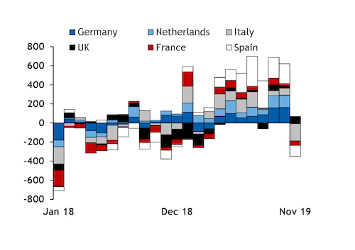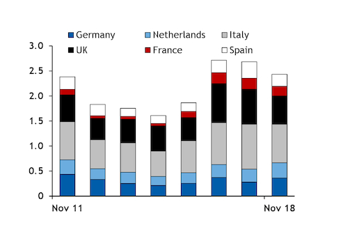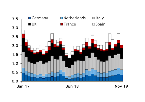 Combined power sector gas consumption in Germany, the Netherlands, France, the UK, Italy and Spain climbed to around 2.7 TWh/d in October from 2.1 GWh/d a year earlier and was the highest for the month since at least 2011. It was the strongest power sector gas burn for any month since at least the 2.9 TWh/d in January 2017 when a deep cold snap lifted power and gas demand across the continent and renewable output had been weak.