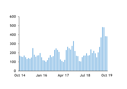 But the 620 GWh/d rise in gas burn was not enough to offset the fall in injections in northwest Europe. Combined injections at German, Dutch and French sites — excluding Norg, which is filled directly from the Groningen field — were only 80 GWh/d in October, down from 968 GWh/d a year earlier.