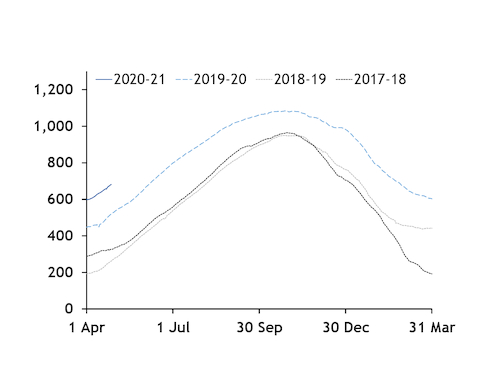 And the stockbuild has got off to a fast start, pushing inventories further above average. Weak weather-adjusted consumption — with several countries in lockdown to contain the spread of the Covid-19 pandemic — has freed up even more supply for injections.