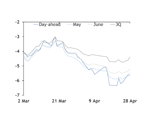 Storage inventories could close in on capacity across much of Europe in mid- to late summer. And declining injection capacity as reservoir pressure rises could force the stockbuild to step lower in some facilities, even if there is an incentive to continue to maximise injections with European near-curve prices in steep backwardation (see TTF prices graph).